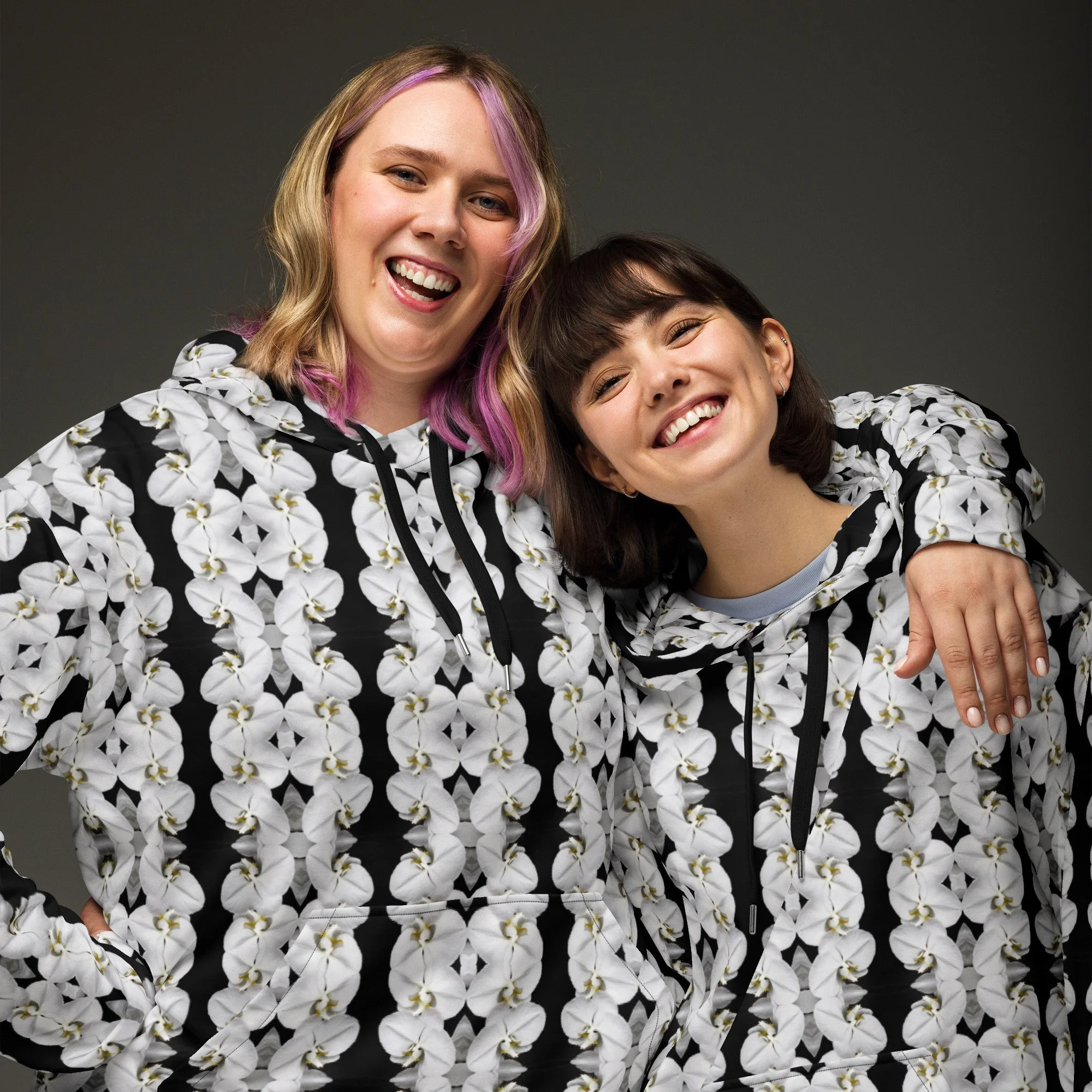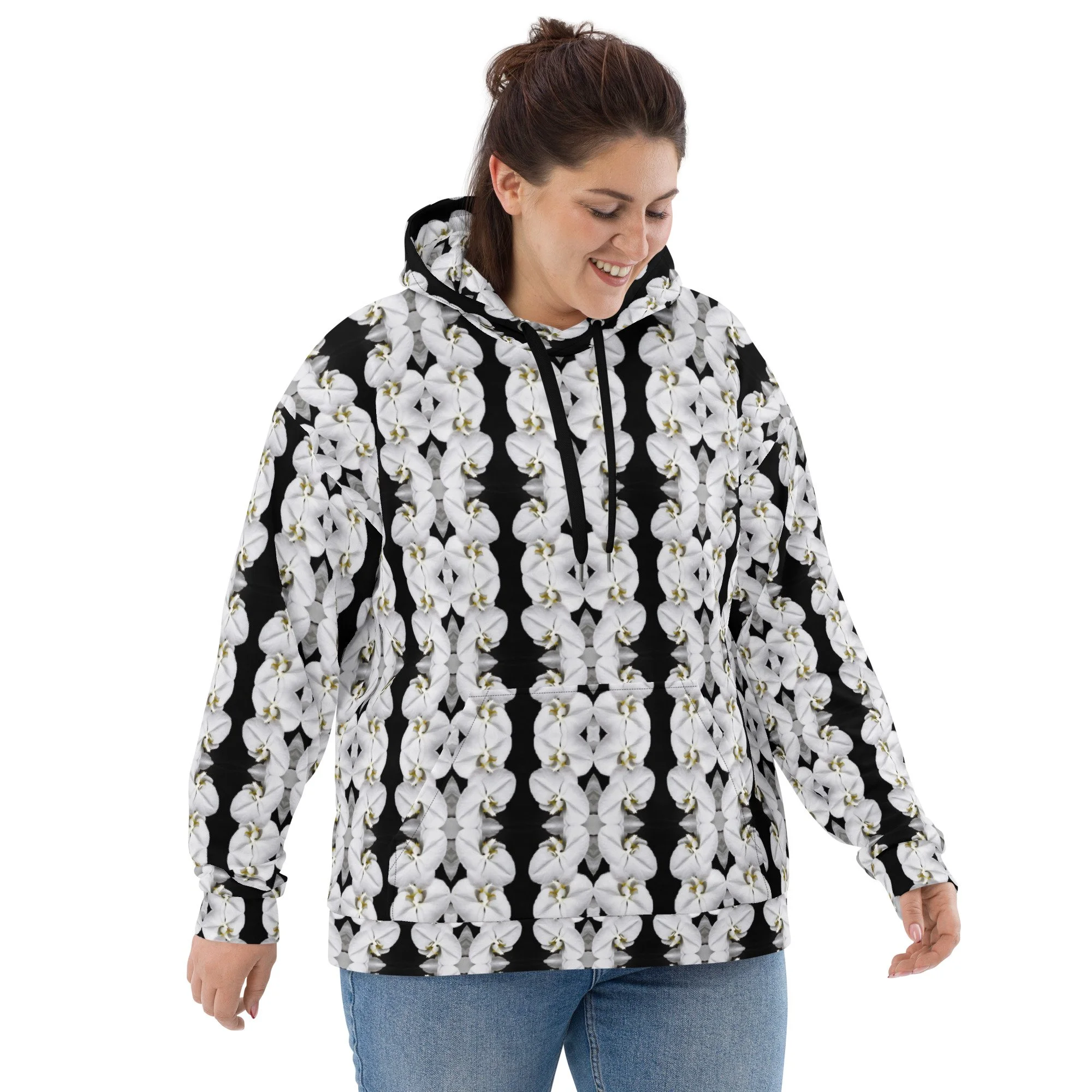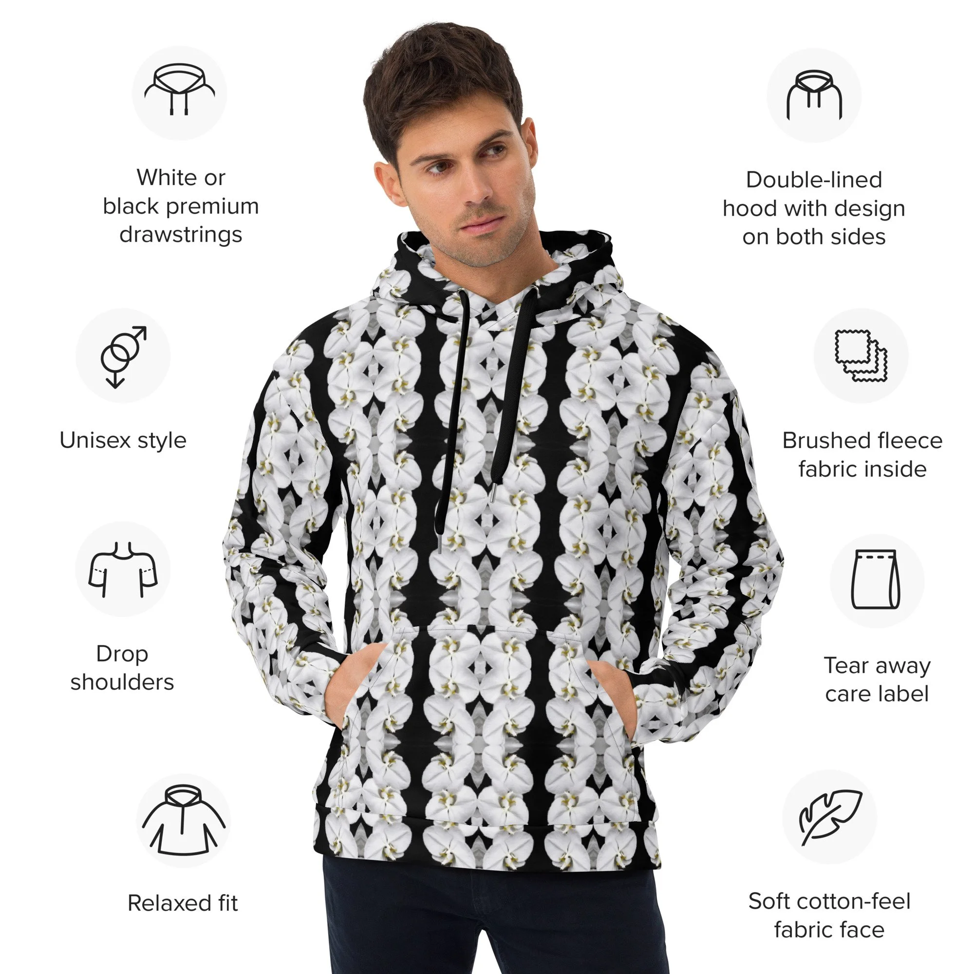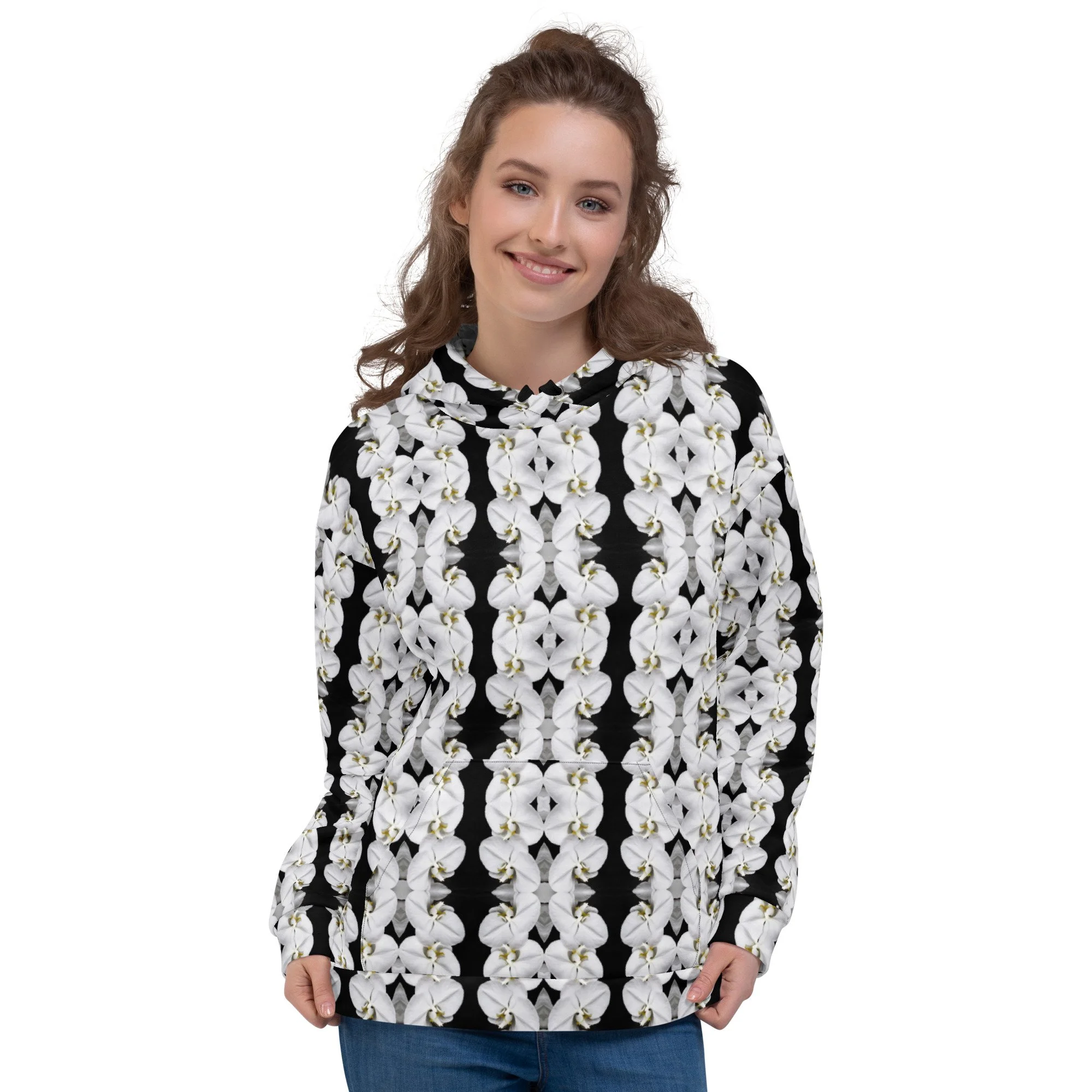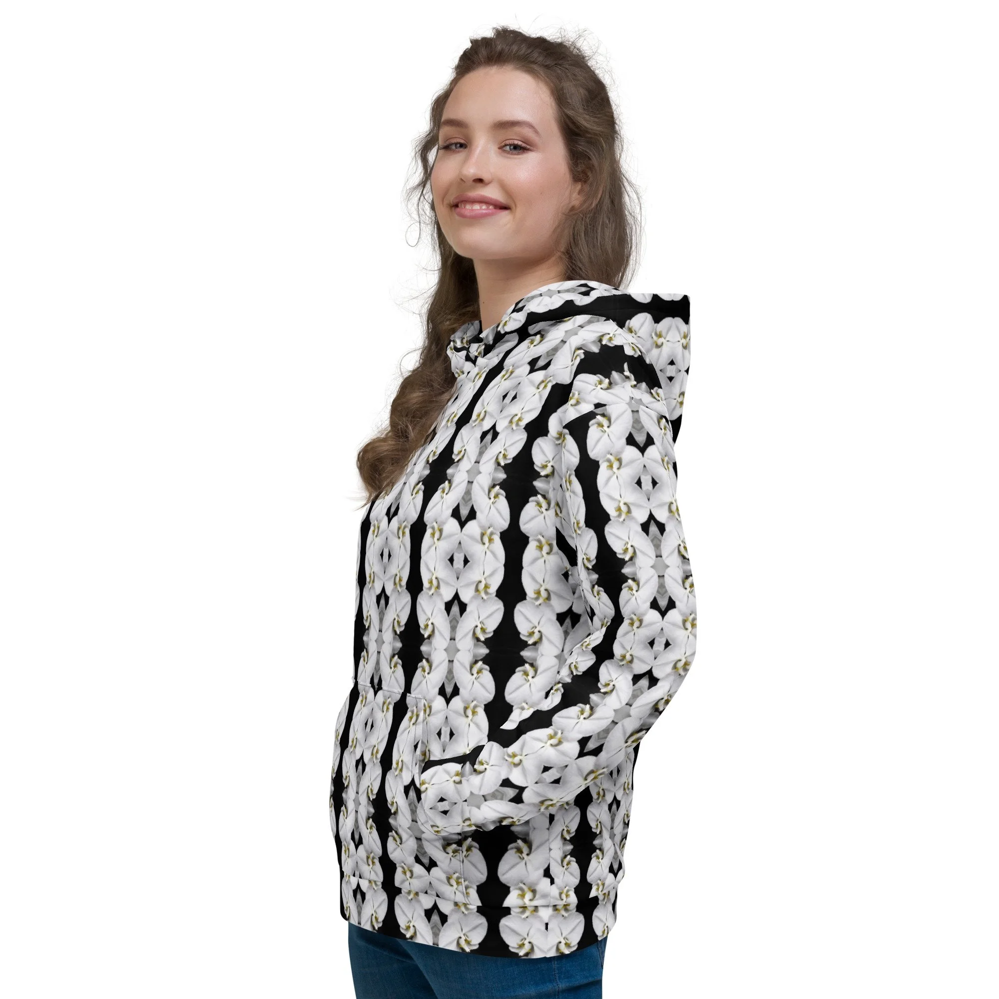 "White Moth Orchids Patterned" Pull Over Photo Hoodie